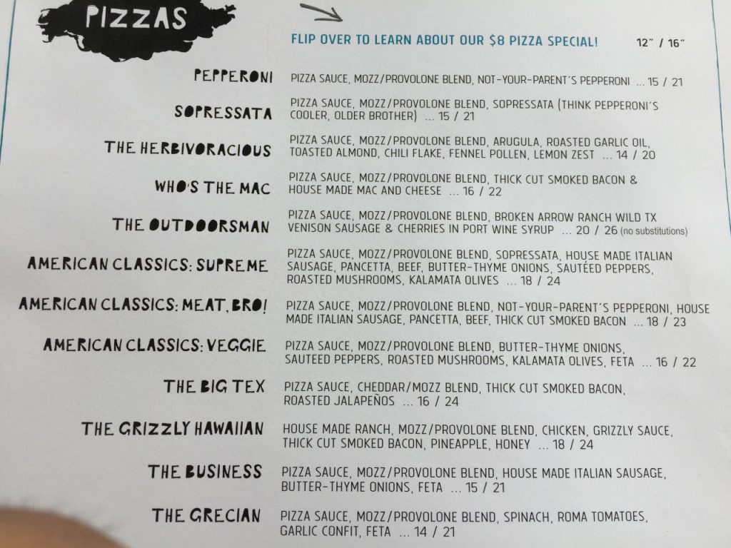 Well, it’s road trip time again. Henry wasn’t able to get a kitchen pass, so I’ll (Larry) be going it alone. First stop this year is π Pizza in Houston Texas. This place is described as a “happening haunt serving inventive pizzas, sandwiches, frozen cocktails & liquor-infused ice cream”. I arrived at 11:15 on Monday morning and the place was empty. I left at noon, and the place was still empty. I ordered the Meat Bro pizza which is topped with pepperoni, house made italian sausage, pancetta, beef, and thick smoked bacon, with pizza sauce and a mozzarella/provolone blend. The lunch special was an 8″ pizza for $8. Just enough pizza for a meal. I also ordered a Lobo Negro from Pedernales Brewing in Fredericksburg Tx. Just one tough… I’m driving. The pizza came in a timely fashion and was perfectly charred on the top and had a crisp bottom. The toppings were tasty and ample. The house made sausage was the best. The crust was a little thicker than I prefer. It was pushing 3/8″ and one part of it was almost 3/4″ thick. This inconsistency brought the overall score down, so I’ll have to give it 7 anchovies out of 10. And yes, I’ll stop back again if I’m in the neighborhood.